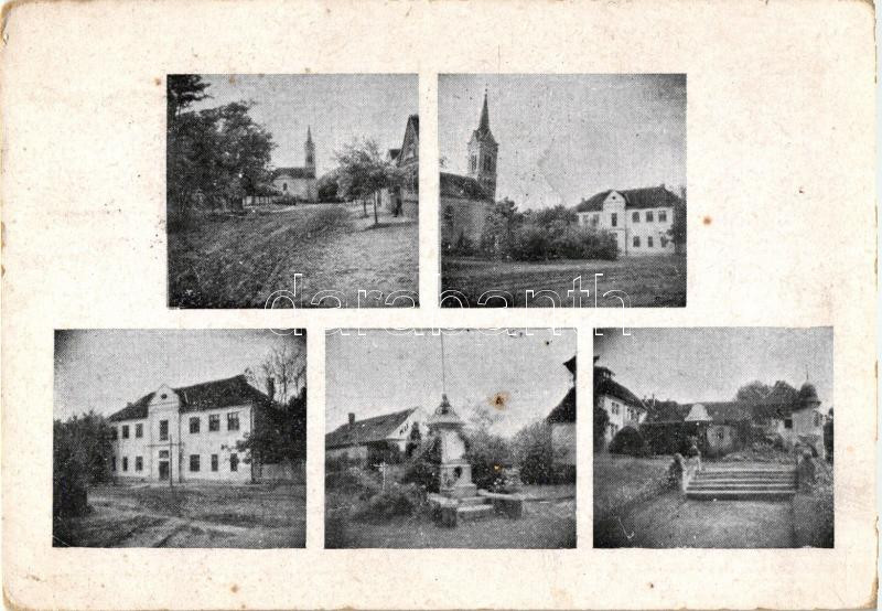 Mozsgó, Katolikus templom, I. világháborús hősi emlék az Országzászlóval, Biedermann-kastély, iskola, kiadja a Turul képeslap kiadó vállalat (EB)