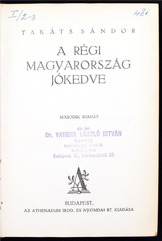 Description: Takáts Sándor: A régi Magyarország jókedve. Bp., é.n., Athenaeum. 400 p. Dúsan aranyozott gerincű kiadói félbőr kötésben. Tulajdonosi pecséttel. Egy előzék sérült, több lapon átütő barna folt található.