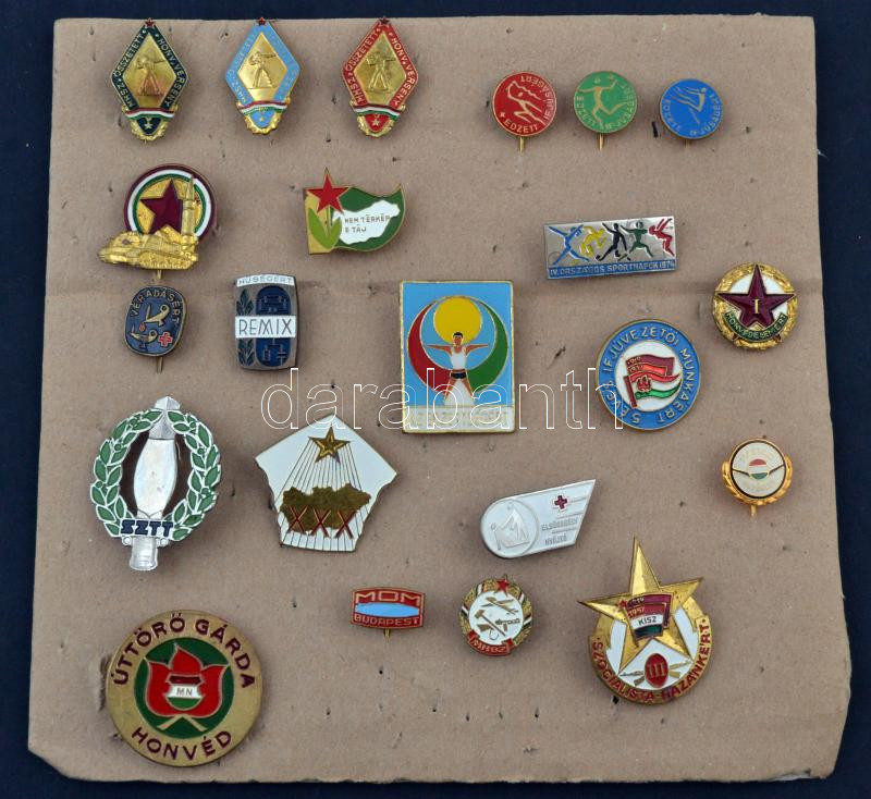 22db vegyes jelvény magyar szocialista jelvény, kitűző, közte "MHSZ Összetett Honvéd Verseny" festett fém jelvény, "Elsősegély nyújtó" festett fém jelvény T:2