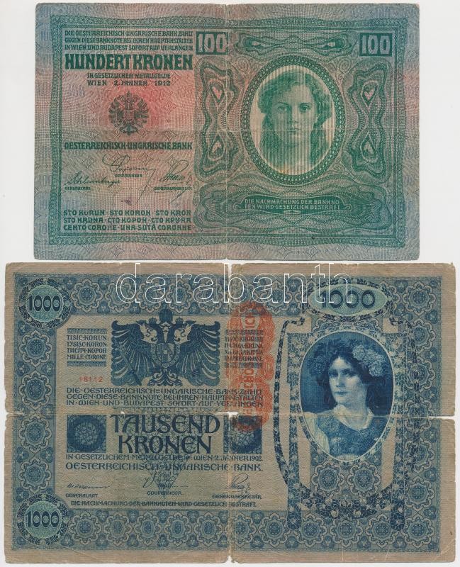 1902. 1000K mindkét oldal német + 1912. 100K + 1913. 20K II. kiadás + ... https://www.darabanth.com/en/265-Online-auction/265.0/Numismatics/Hungarian-Banknotes~400007/1902-1000K-mindket-oldal-nemet-plus-1912-100K-plus-1913-20K-II-kiadas-plus-1915-10K-plus-1917-2K-mindeg~II1324092