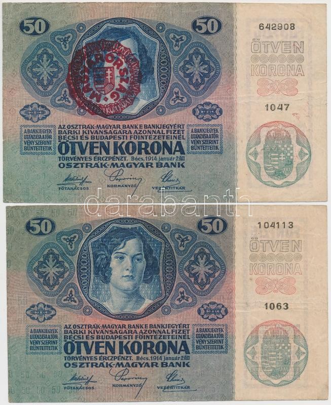 https://www.darabanth.com/en/265-Online-auction/265.0/Numismatics/Hungarian-Banknotes~400007/1914-1920-50K-3x-egyik-piros-MAGYARORSZAG-felulbelyegzessel-TIII~II1327490