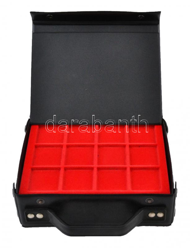 8db érmetartó bársony tálca klf méretű érmék tárolására, összesen 140 férőhellyel, fekete bőröndben