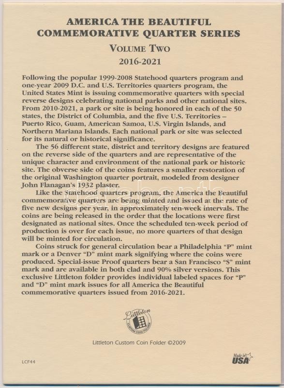 Description: Amerikai Egyesült Államok "AMERICA THE BEAUTIFUL COMMEMORATIVE QUARTERS VOLUME TWO 2016-2021" 60 férőhelyes gyűjtői album használatlan állapotban