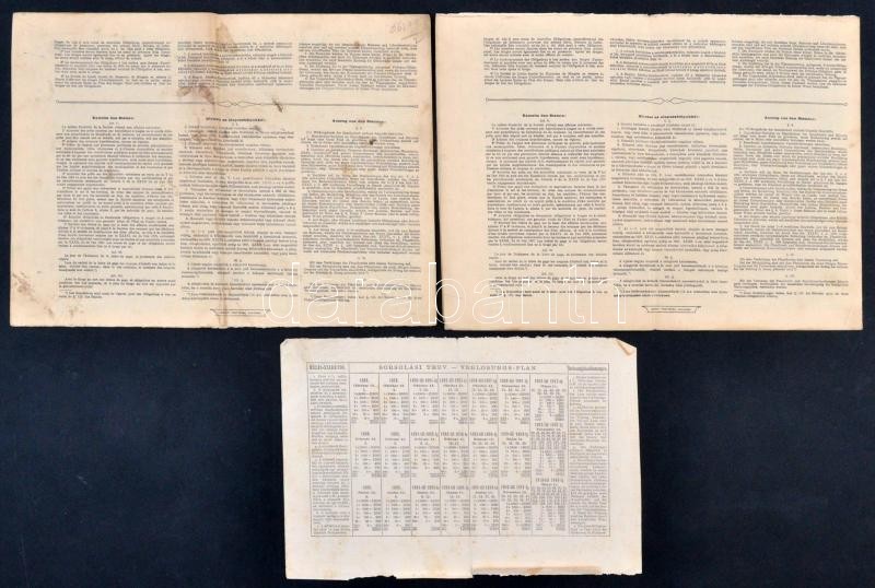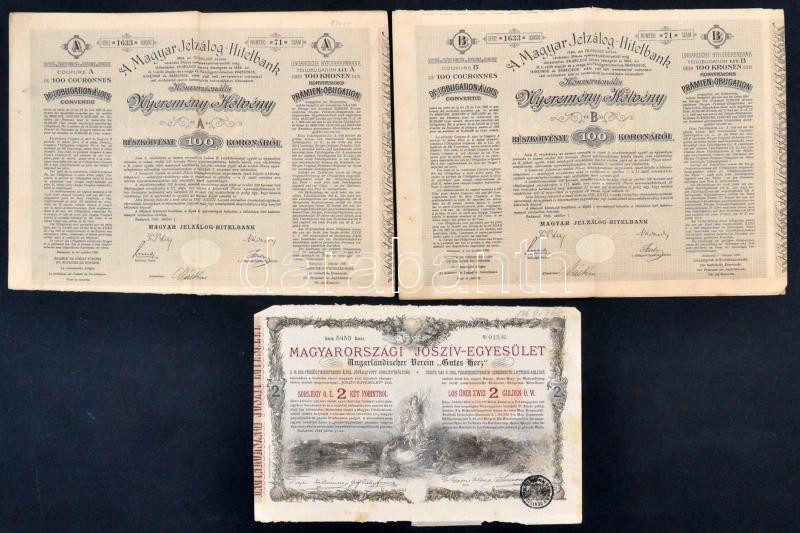 Description: Budapest 1888. "Magyarországi Jószív-Egyesület" sorsjegykölcsön 2Ft-ról, szárazpecséttel, bélyegzésekkel + 1906. "A Magyar Jelzálog-Hitelbank" nyereménykötvénye 100K-ról, (2x) A és B részkötvény, mindkettő szárazpecséttel T:III szakadás