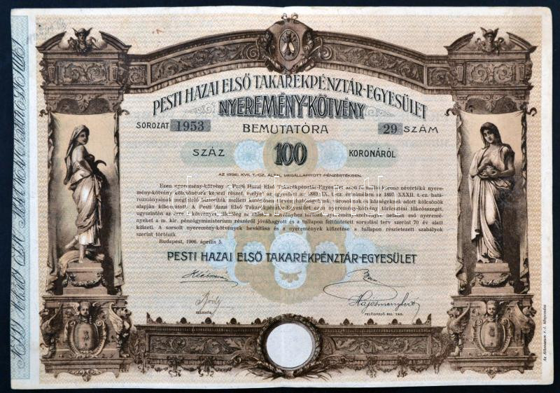 Budapest 1906. "Pesti Hazai Első Takarékpénztár-Egyesület" nyeremény-kötvénye 100K-ról, szárazpecséttel T:II-,III
