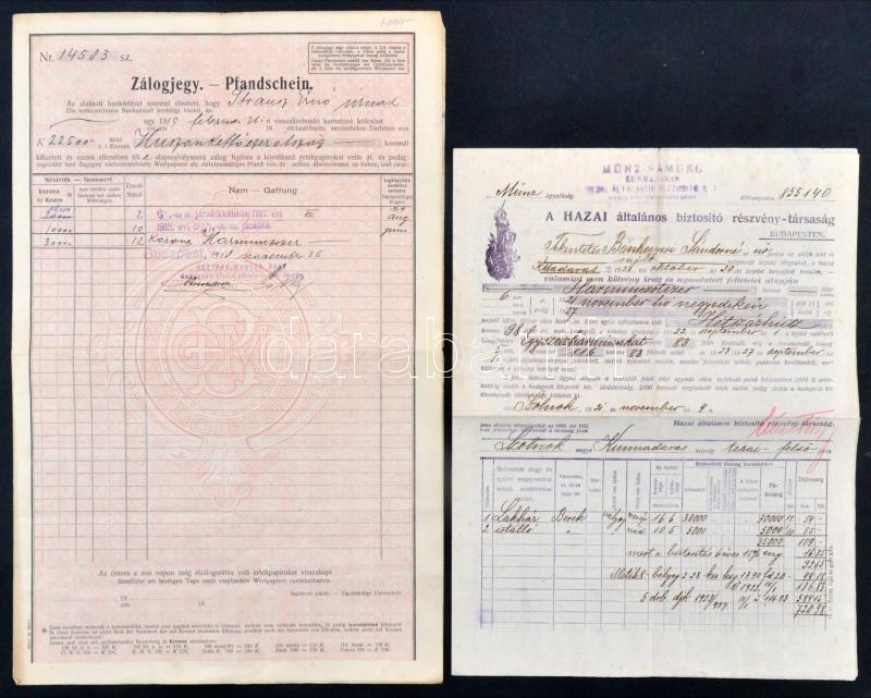 Budapest 1919. "Osztrák-Magyar Bank" zálogjegye + 1921. "A Hazai általános biztosító részvény-társaság" tűzkár biztosítási okmány T:III,III-