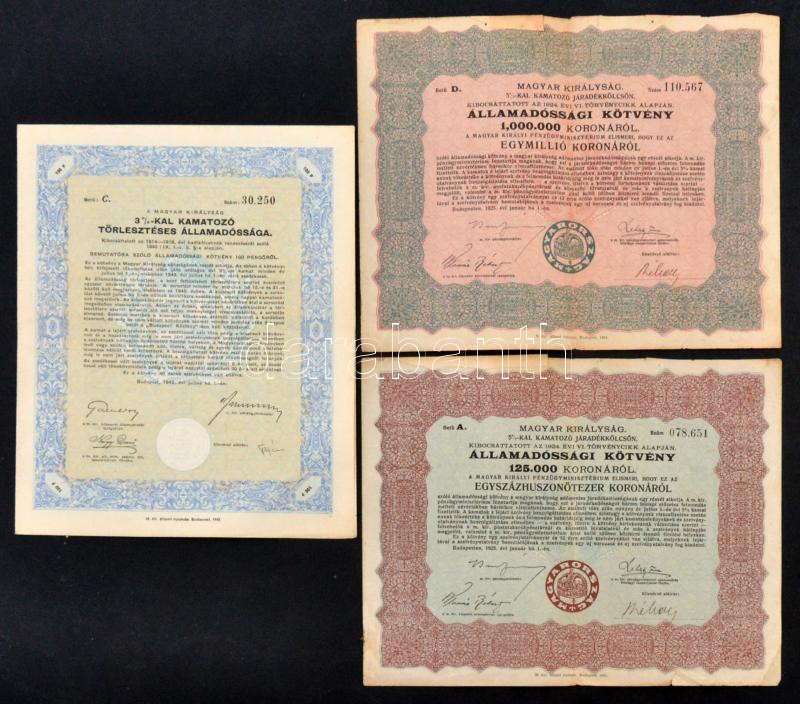 Description: Budapest 1925. "Magyar Királyság 5%-kal kamatozó járadékkölcsön" államadóssági kötvény 125.000K és 1.000.000K-ról szelvényekkel + 1942. "A Magyar Királyság 3%-kal Kamatozó Törlesztéses Államadóssága" kötvénye 100P-ről szelvényekkel T:III szakadások