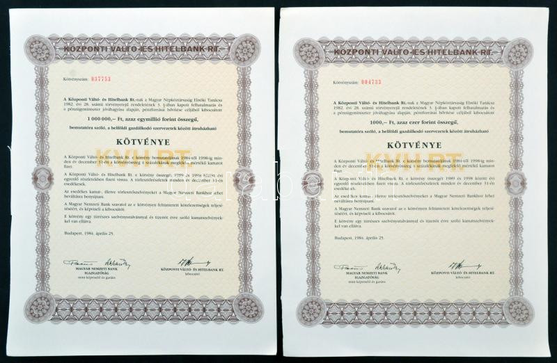 Budapest 1984. "Központi Váltó- és Hitelbank Rt." kötvénye 1000Ft-ról és 1.000.000Ft-ról, szelvények nélkül T:I-