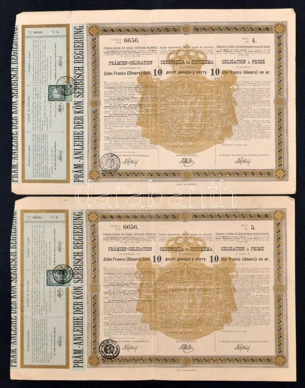 Szerbia / Belgrád 1889. "Prémium Kötvény 10 arany dénárról" ... https://www.darabanth.com/en/265-Online-auction/265.0/Numismatics/Shares-and-Tickets~400005/Szerbia-Belgrad-1889-Premium-Kotveny-10-arany-denarrol-osztrak-felulbelyegzessel-es~II1328445