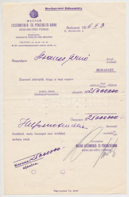 Szolnok 1914. "Fonciére, Pesti biztosÃtó-intézet" felszólÃtás befizetésre + Budapest 1926. "Magyar Leszámitoló- és Pénzváltó-Bank Berlini-téri fiókja" 25.000K felvételérÅ‘l szóló bizonylat T:III