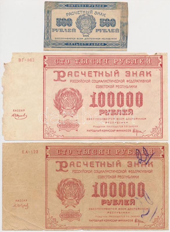 Szocialista Szövetségi Szovjet Köztársaság 1921. 500R + 100.000R (2x) ...