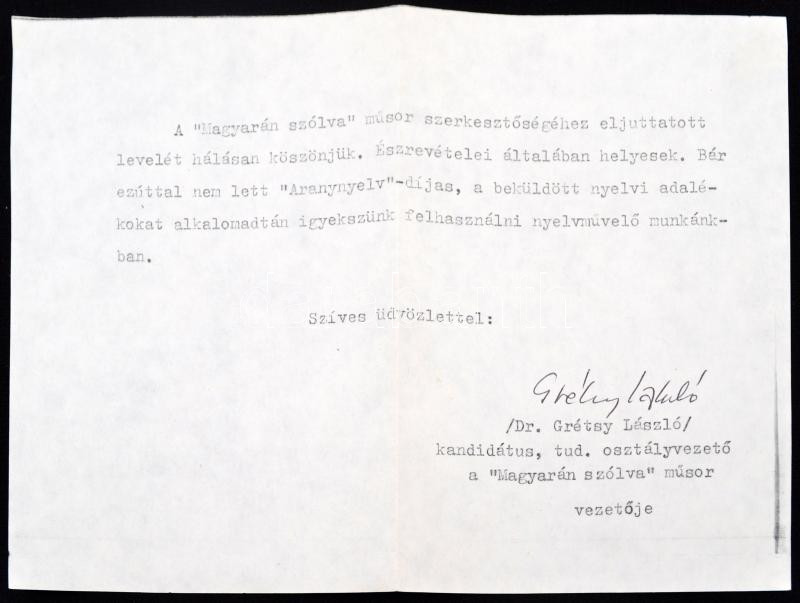 Grétsy László (1932 -) nyelvész, főiskolai tanár gépelt, autográf alá...