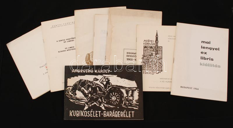 Description: 8 db különféle magyar nyelvű ex librisekkel, grafikákkal kapcsolatos érdekes nyomtatvány, katalógus, így benne: Andruskó Károly fametszetei, Mai lengyel ex libris kiállírás, Kisgrafikai értesítő, stb.