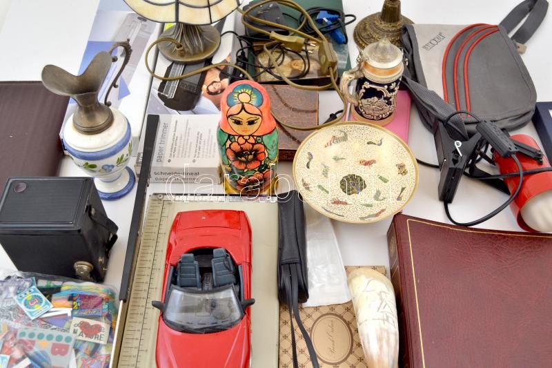 Nagy vegyes bolha tétel: matrjoska baba, lámpa, papírvágó, felvarrók, ...