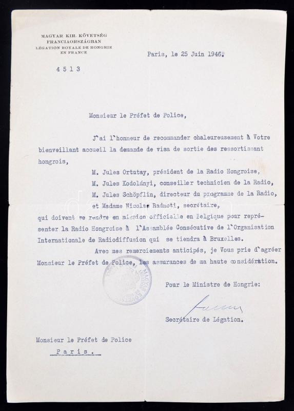https://www.darabanth.com/en/265-Online-auction/265.0/Other-collectibles/Historical-documents-manuscripts~17/1946-A-francia-magyar-nagykovetseg-levele-a-parizsi-rendorbiztosnak-Ortutay-Kodolanyi-Scho~II1292430