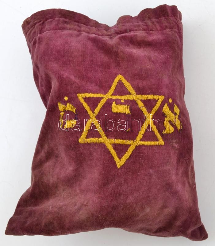 Description: cca 1920 Fejre és kézre való tefilin, azaz zsidó bőr imaszíjak dobozkákkal. A dobozok fából vannak, két lap mentén összevarrva. Dávid-csillagos, kézi hímzésű bársony bájtliban. / cca 1920 Jewish ritual objects, an arm-tefillin and a head-tefillin. The boxes are wooden-made and its parts are sewn together. Also, a velvet tefillin bag with a handmade Star of David embroidery on it.