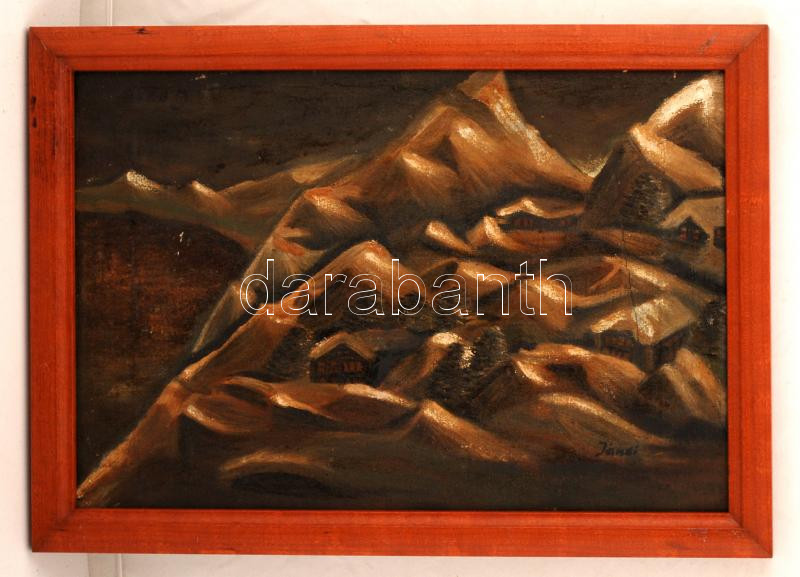 Jándi jelzéssel: Házak a hegyen. Olaj, vászon, keretben, 30×45 cm