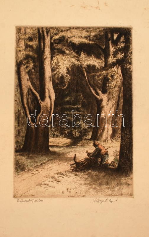 Komjáti-Wanyerka Gyula (1894-1958): Rőzseszedő. Színezett rézkarc, pap...
