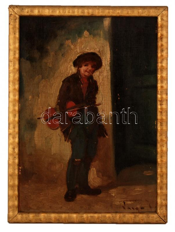 Olvashatatlan jelzéssel: Utcazenész. Olaj, farost, keretben, 23×34 cm