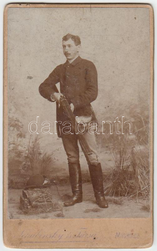 cca 1900 Férfi vadászpuskával, keményhátú fotó Schabinszky és Társa miskolci műterméből, 11x7 cm