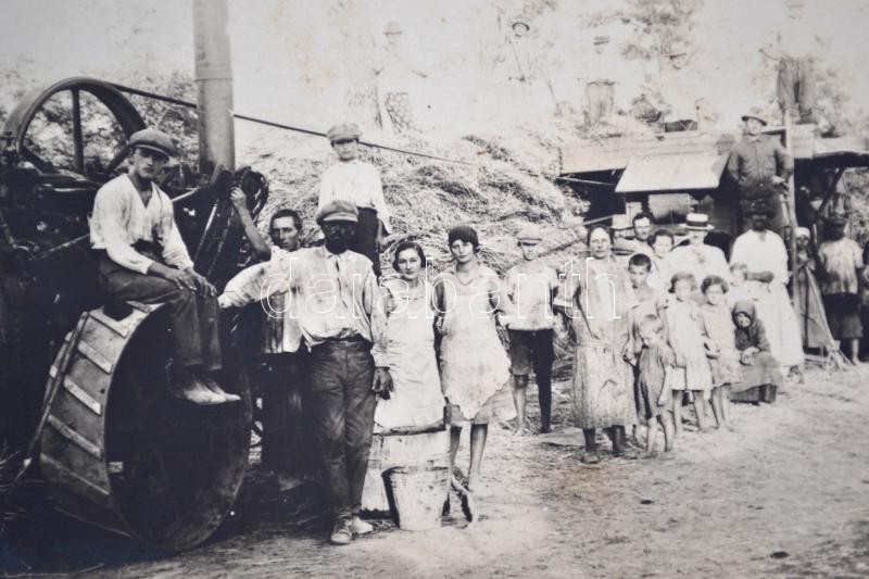 cca 1910 Csoportkép cséplőgéppel, 9×14 cm