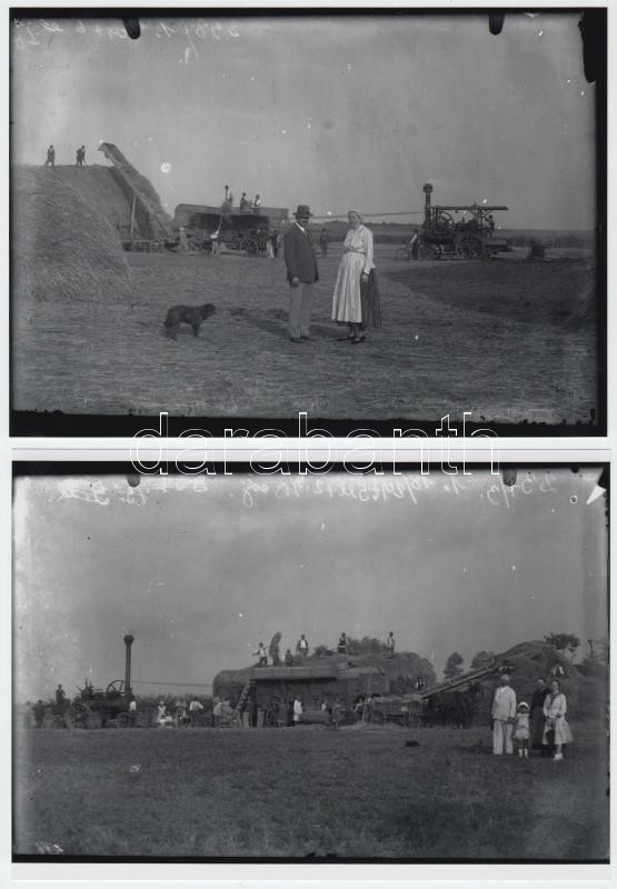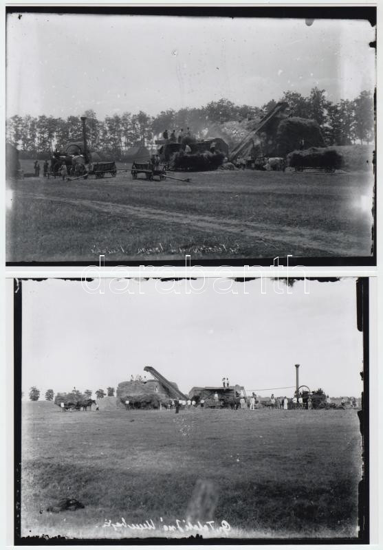 Description: cca 1935 Gr. Teleki József birtokán gőzgéppel hajtott cséplőgép, Lőcsei Árpád kecskeméti vándorfényképész hagyatékában őrzött 4 db üveglemez negatívról készült modern nagyítások, 13x18 cm