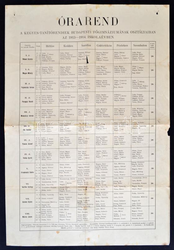 1913 Órarend a Kegyes Tanítórendiek Budapest Főgimnáziumának osztályaiban az 1913-1914. iskolaévben, kis szakadásokkal, 59x42 cm