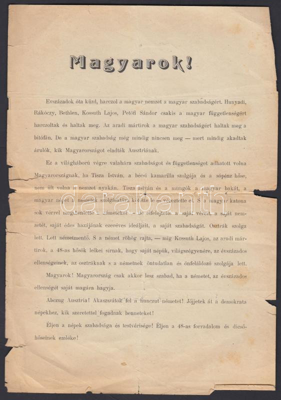 https://www.darabanth.com/en/265-Online-auction/265.0/Other-collectibles/Printed-Materials~200295/1918-Magyarok-felhivas-az-1848-as-evforduloja-alkalmabol-roplap-25x17-cm~II1325156