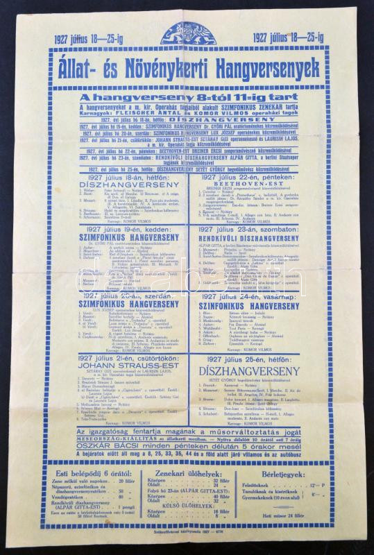 1927 Állat- és Növénykerti Hangversenyek nagyméretű plakátja, hajtott,...