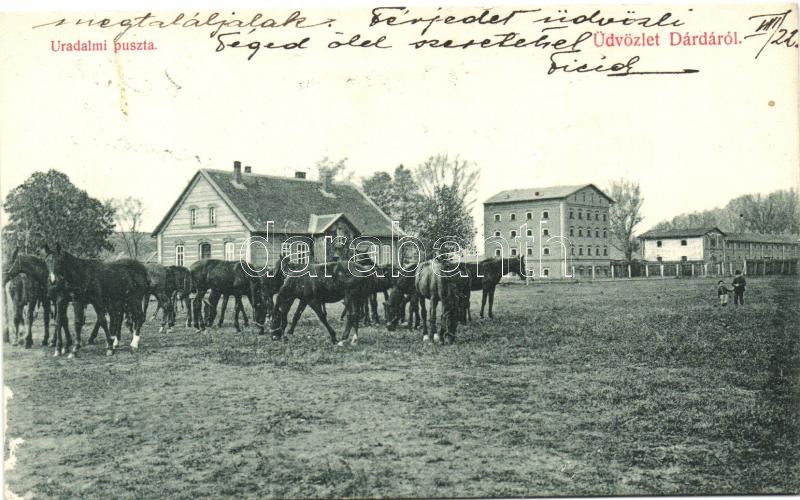 Dárda, Darda; Uradalmi puszta, a ménes lovai, kiadja Arady Lajos könyvnyomdász- és könyvkereskedő / estate, horse herd (kopott sarok / worn edge)
