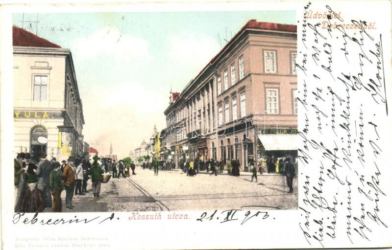 Debrecen, Kossuth utca, Ifj. Pajor üzlete, kiadja Pongrácz Géza Kiss Ferenc eredeti fényképe alapján