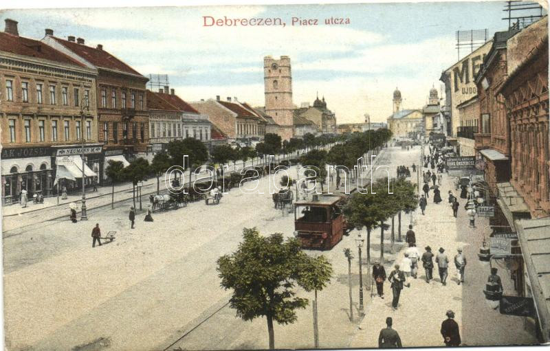 Debrecen, Piac utca, villamos, Lofkovits Arthur és Neumann üzlete, Központi szálloda (EK)