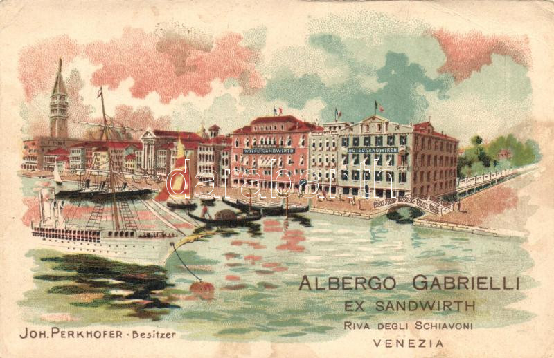 Venice, Venezia; The Hotel Albergo Gabrielli, formerly known as Hotel Sandwirth, owned by Joh. Perkhofer, steamship, litho (EB)