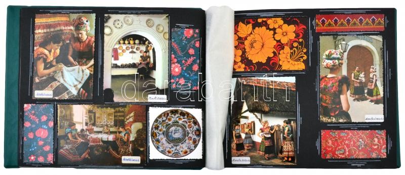 Description: ~107 db MODERN, színes, motívum képeslap és újságkivágások, zöld színű albumba ragasztva, folklór motívum / ~107 modern, color motive postcards glued in green color postcard album, folklor motive