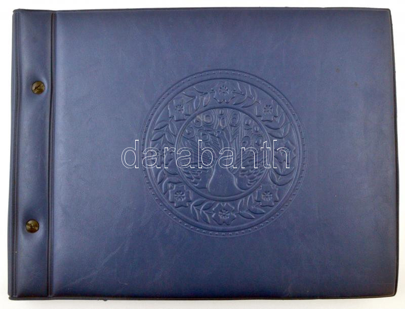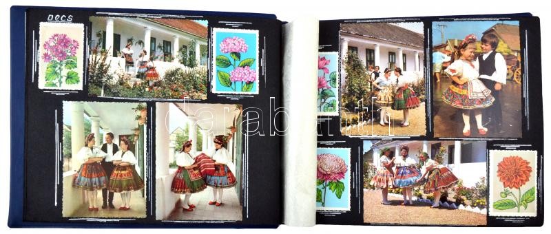 ~203 db MODERN, színes, motívum képeslap, kék színű albumba ragasztva, folklór és virág motívumok, a virág motívumlapok erősen vágottak, az utolsó oldal hozzátapadt a borítóhoz / ~203 modern, color motive postcards glued in blue color postcard album, among the motives folklore and flowers, the flower cards are heavily cut, the last page is stuck together with the cover