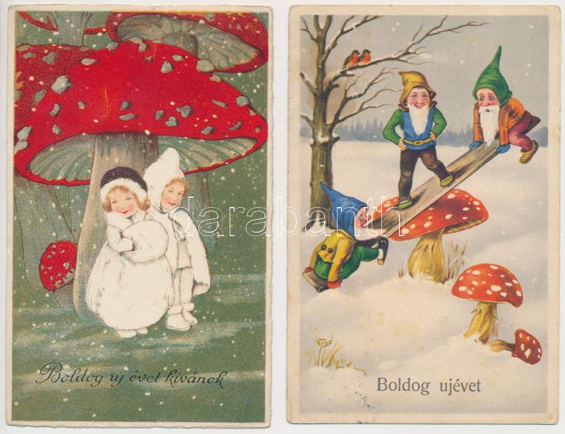 7 db RÉGI újévi üdvözlőlap, gombákkal és törpékkel, pár litho / 7 old New Year greeting postcards with mushrooms and dwarves, some lithos