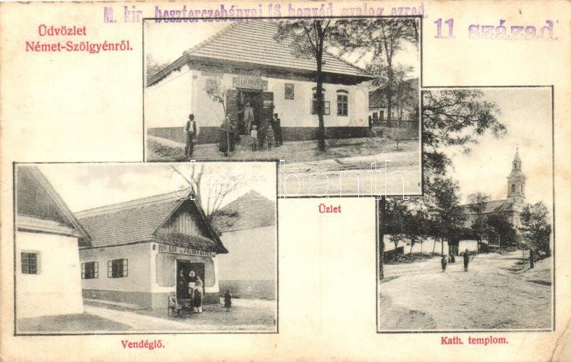 Németszőgyén, Nemecky Seldín; Kellner Márkusz vegyeskereskedése, vendéglő, katolikus templom. Kellner Márk kiadása / shops, restaurant, church (EB)