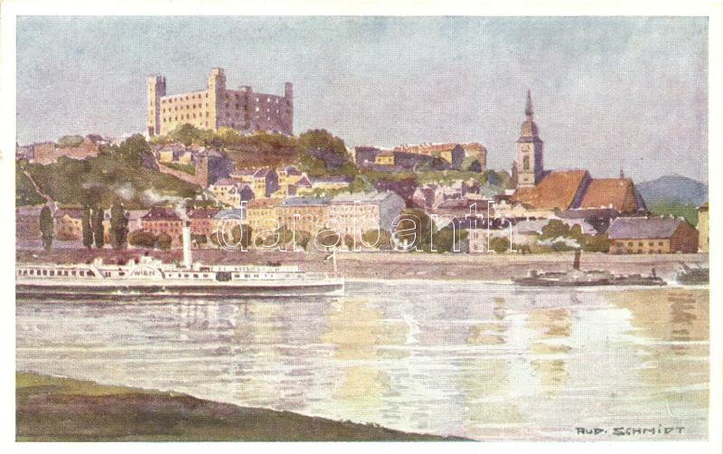 Pozsony, Látkép a Wien gőzhajóval; a Duna Gőzhajózási Társaság kiadása / with SS Wien s: Rud Schmidt