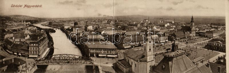 Nagyvárad, Oradea; híd, zsinagóga, tér, Szent László templom, Holdas templom, kétlapos panorámalap, kiadja Boros Jenő / híd, syangouge, square, churches, 2-tile panoramacard