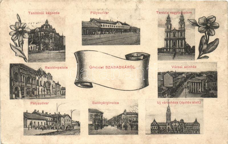 Szabadka, Subotica; Tanítónői képezde, pályaudvar, Terézia nagytemplom, Recikl-palota, Városi színház, Batthyányi utca és az építés alatt álló városháza rajza / teachers school, railway station, cathedral, palace, theater and the graphic depiction of the town hall under construction, floral (ázott / wet damage)