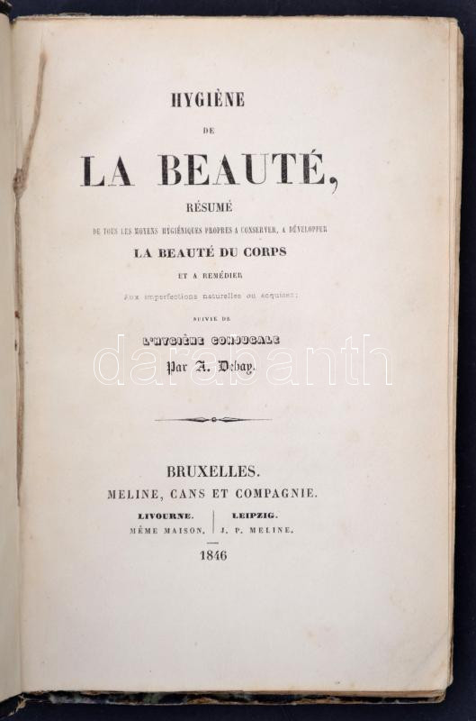 Description: August Debay: Hygiene de la beaute, resume de tous les moyens hygieniques propres a conserver, a developper la beaute du corps et a remedier aux imperfections naturelles ou acquises. Bruxelles, 1845, Meline, Cans et co. 224 p. Korabeli, pótolt gerincű félvászonkötésben, jó állapotban.
