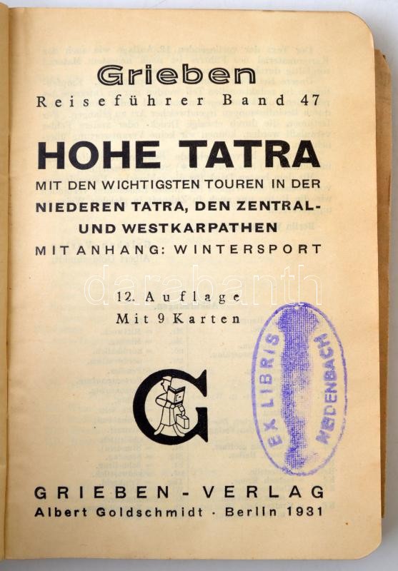 Hohe Tatra mit den wichtigsten Touren in der Niederen Tatra, den Zentral- und Westkarpathen. Berlin, 1931, Grieben Verlag (Grieben Reiseführer 47). Számos térképmelléklettel. Papírkötésben, gerincén apró sérüléssel, jó állapotban.