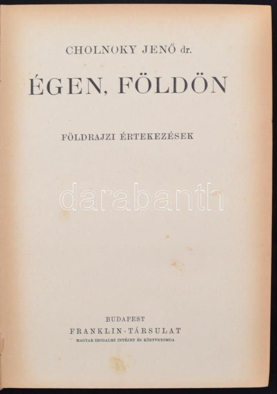 Magyar Földrajzi Társaság Könyvtára: Cholnoky Jenő: Égen, földön. Földrajzi értekezések. Bp., é. n., Franklin Társulat. Aranyozott vászonkötésben, jó állapotban