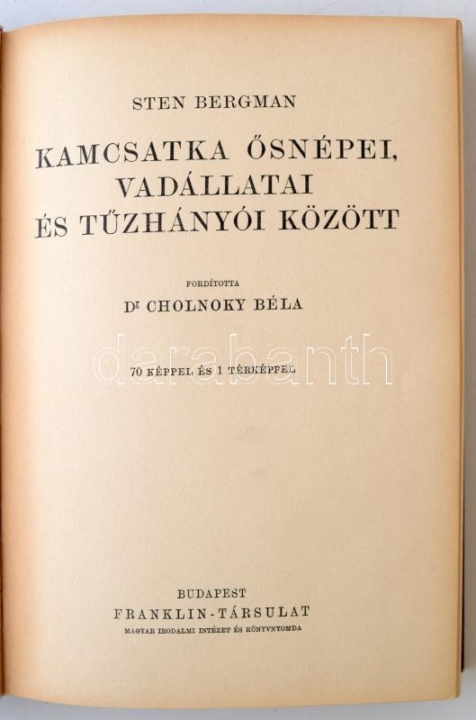 Sten Bergman: Kamcsatka ősnépei, vadállatai és tűzhányói között. Fordította Dr. Cholnoky Béla. 70 képpel és 1 térképpel. A Magyar Földrajzi Társaság Könyvtára. Bp., Franklin Társulat. Kiadói festett, aranyozott egészvászon-kötésben, a gerinc kissé kopottas, egyébként jó állapotban.