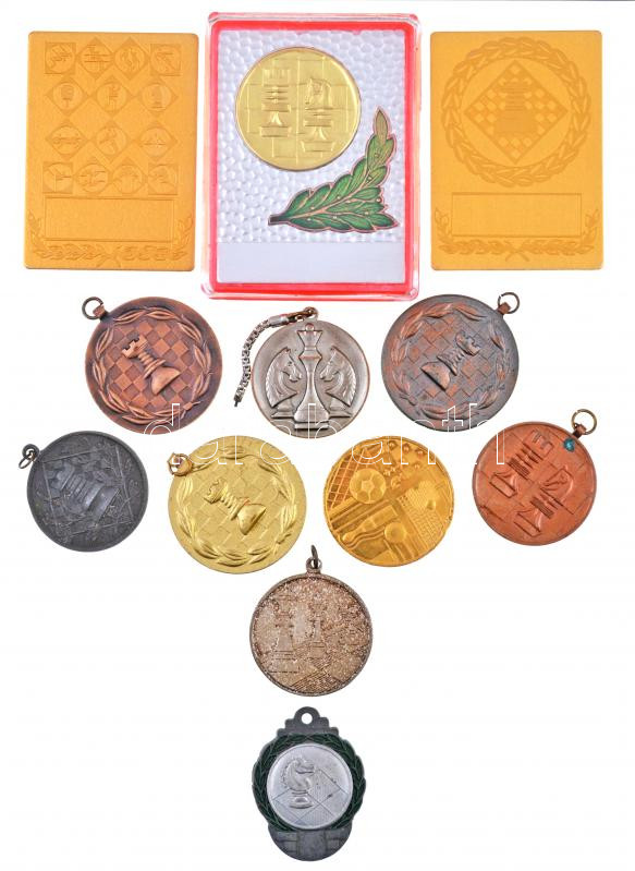12db-os vegyes magyar és egy külföldi sakk díjérem és plakett tétel, közte 1950. "MADOS Budapesti Alszövetség Csapatbajnokság 1950. III. oszt. I. hely" fém díjérem füllel, "LUDVIG" gyártói jelzéssel (35mm), 1967. "III. Sütőipari Sportnap 1967" fém díjérem (33x44mm) T:1-,2,2-