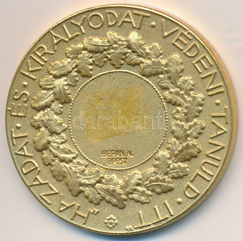 Reményi József (1887-1977) 1926. "Budapesti Polgári Lövész Egyesület / Hazádat és királyodat védeni tanuld itt" aranyozott fém díjérem "BERÁN N. BPEST" gyártói jelzéssel (35mm) T:2 hátlapján ragasztásnyom