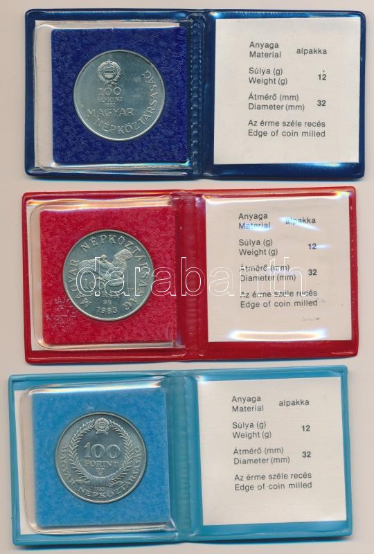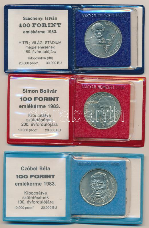 1983. 100Ft alpakka "Czóbel Béla" + 100Ft alpakka "Simon Bolivár" + 100Ft alpakka Széchenyi István" mindegyik eredeti tokban, tanúsítvánnyal T:BU