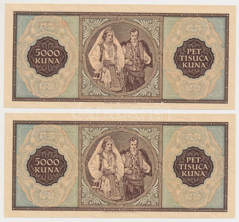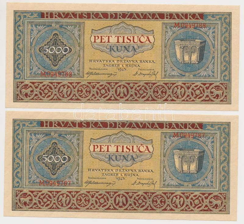 Independent State of Croatia 1943. 5000 Kuna (2x) sequential serials C:UNC,AU
