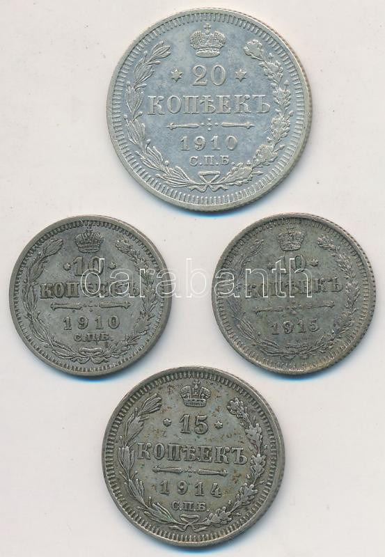 Description: Orosz Birodalom 1910. 10k Ag + 20k Ag + 1914. 15k Ag + 1915. 10k Ag T:2