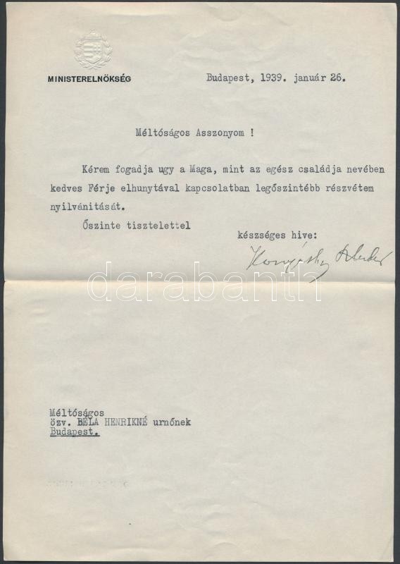Description: 1939 Komjáthy Aladár (1894-1963) költő és természettudós géppel írt részvétnyilvánító levele a miniszterelnökség fejléces papírján saját kézzel aláírva, eredeti borítékban